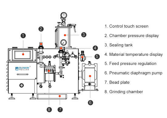 | Model | Power(Kw) | Speed (rpm) | Grinding chamber volume (L) | Zirconium bead filling amount(Kg) | Grinding medium size(mm) | Ultimate fineness (nm) | Feeding pump |